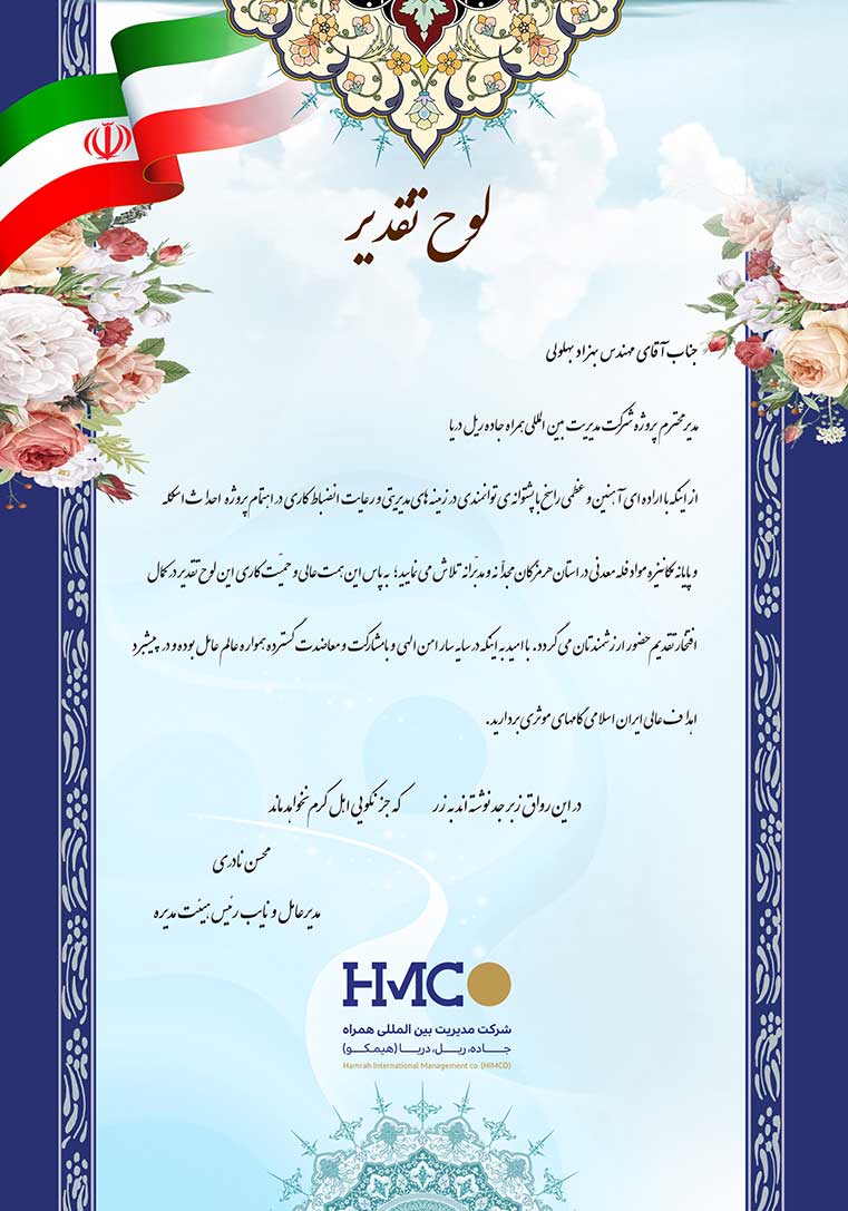 از اینکه با اراده ای آهنین و عظمی راسخ با پشتوانه ی توانمندی در زمینه های مدیریتی و رعایت انضباط کاری در اهتمام پروژه ” احداث اسکله و پایانه مکانیزه مواد فله معدنی در استان هرمزگان ” مجدّانه و مدبّرانه تلاش می نمایید؛ به پاس این همت عالی و حمیّت کاری این لوح تقدیر در کمال افتخار تقدیم حضور ارزشمندتان می گردد. با امید به اینکه در سایه سار امن الهی و با مشارکت و معاضدت گسترده همواره عالم عامل بوده و در پیشبرد اهداف عالی ایران اسلامی گامهای موثری بردارید.